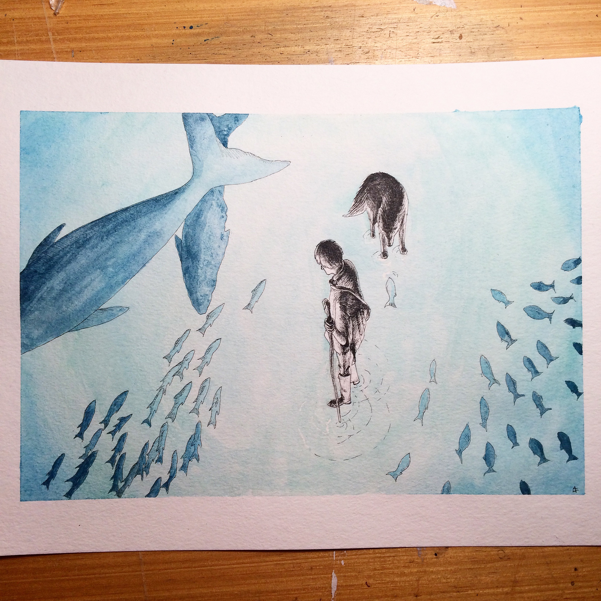 Part of a series depicting a mysterious traveler and his wolf dog.
