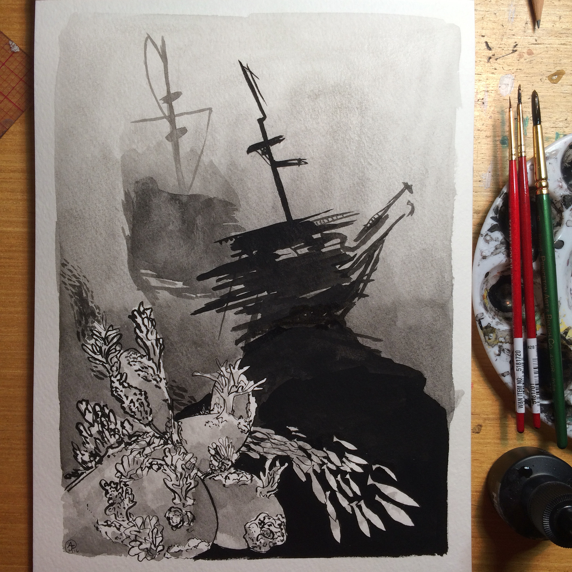 Originally from Inktober, depicting a ship wreck and the rich ocean life that takes over.