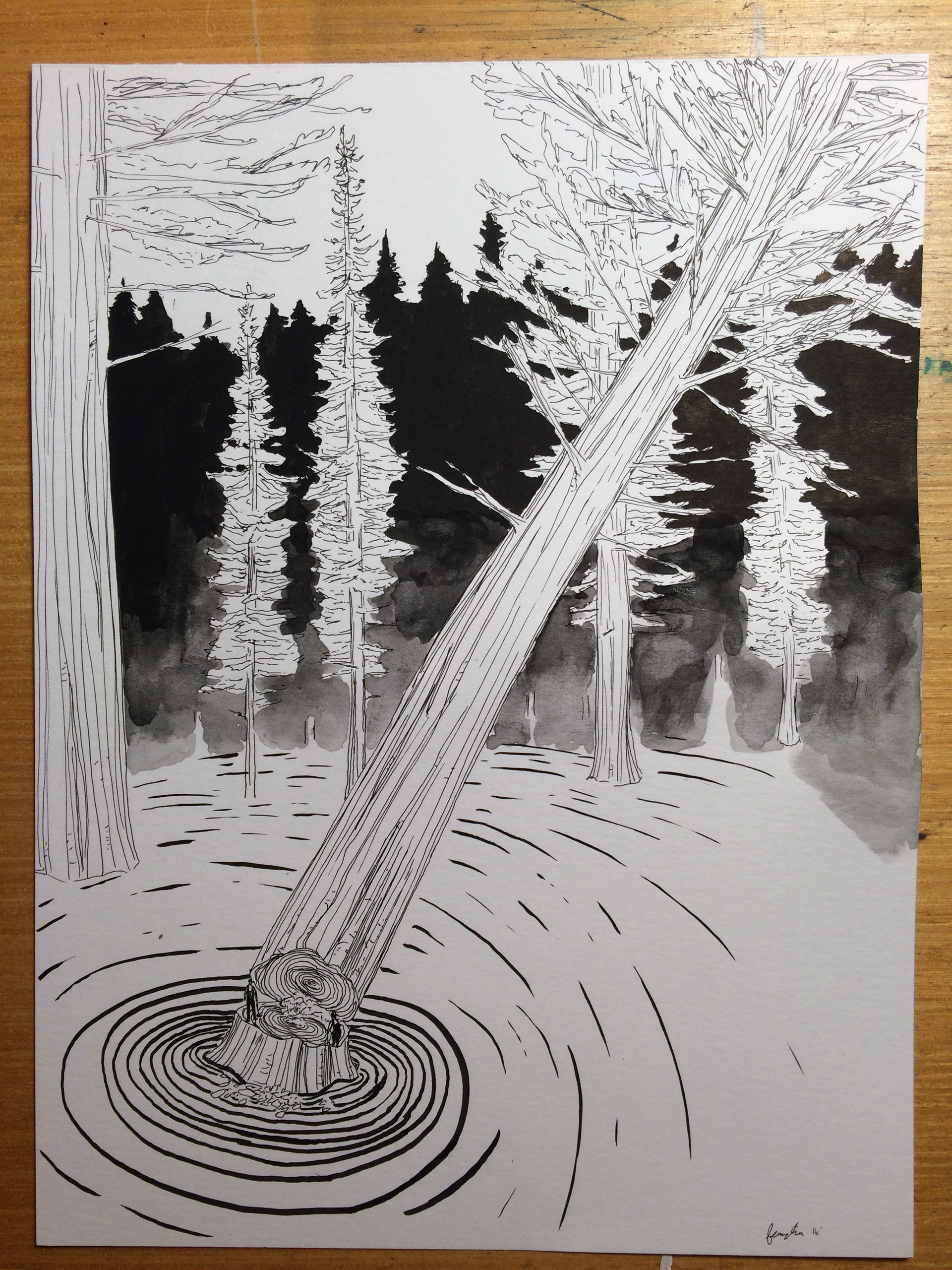 Originally from Inktober, a drawing depicting the cutting down of a redwood in the early 20th century.